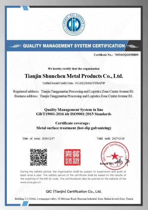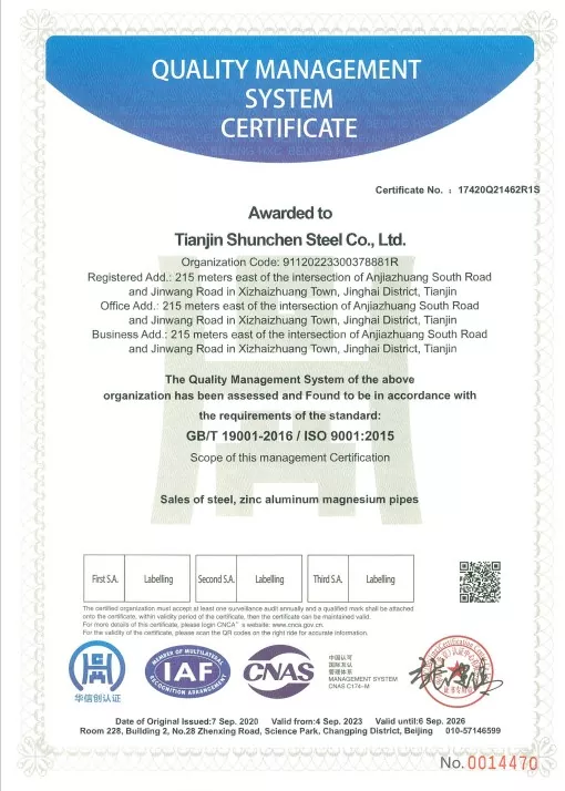 Стандарди: ГБ/Т 3091-2015 „Заварене челичне цеви за транспорт течности под ниским притиском“, ГБ/Т 13912-2020 „Челичне цеви од врућег поцинкованог потапања“. Производ је прошао тестирање треће стране и има извештај о тестирању.