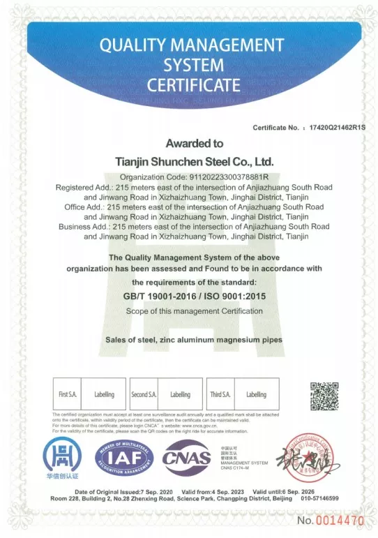 Тиањин Схунцхен Индустриал Цомпани је акумулирала више од три деценије производног искуства у индустрији челика. Компанија поседује ИСО 9000, 3А систем сертификате, као и ЦЕ сертификат Европске уније, и успоставила је комплетан индустријски ланац од прераде галванизације до продаје и дистрибуције. Кроз ригорозне токове процеса у 12 корака и тростепени свеобухватни механизам инспекције, компанија је постигла рекорд од нула годишњих несрећа у погледу квалитета и безбедности и нулте неиспуњавања налога током 12 узастопних година. Схунцхен Индустриал током целе године одржава инвентар од поцинкованог челика од преко 20.000 тона, формирајући велики супермаркет од поцинкованог челика који интегрише складиштење и дистрибуцију. Складиште се простире на површини од 10.000 квадратних метара, пружајући солидну подршку за интегрисану производну и продајну услугу.