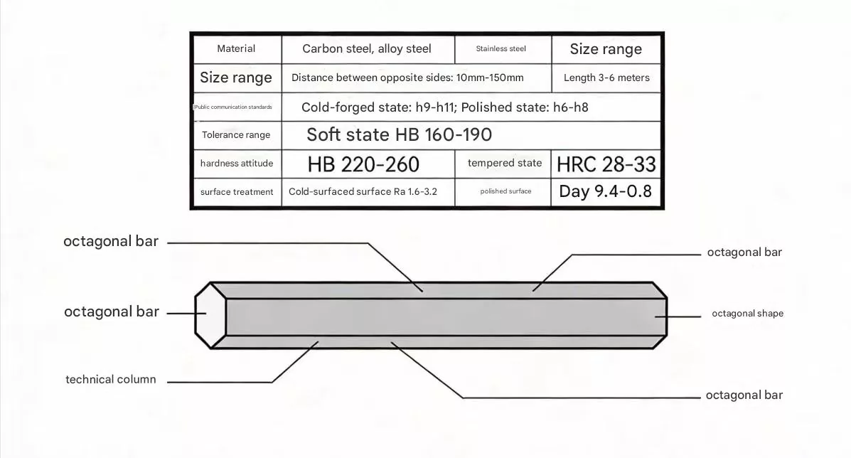 Разликује се од стандардног обичног осмоугаоног челика, јер је прилагођени чврсти метални профил са осмоугаоним попречним пресеком и асиметричном структуром, као што су равни осмоугаони, ексцентрични осмоугаоници или функционалне карактеристике као што су утори за кључеве, утори за уље и равни за позиционирање.
