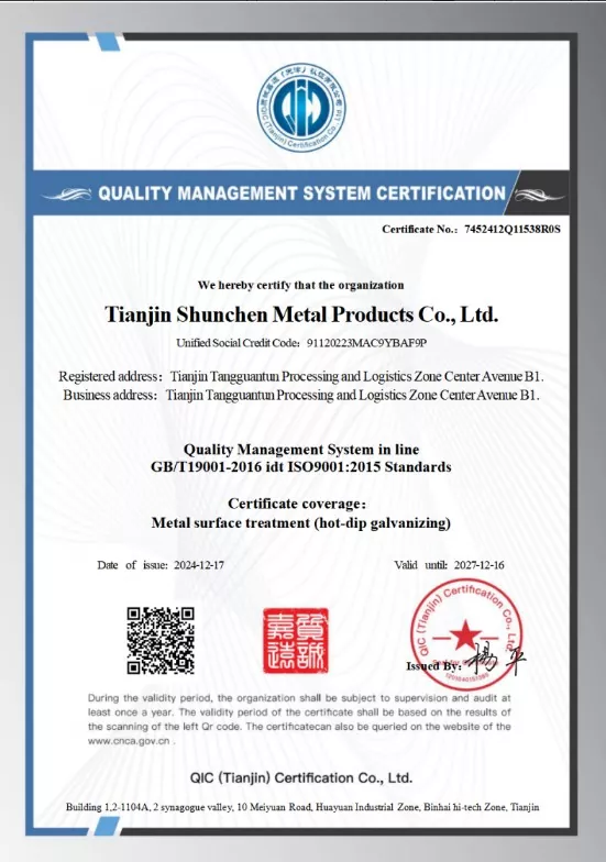 Производ је прошао сертификацију квалитета ИСО9001, у складу је са националним стандардима и пружа извештаје о испитивању материјала трећих страна и сертификате дебљине галванизације. Напредне производне линије за топло ваљање/хладно савијање се користе у производњи како би се осигурала тачност димензија и квалитет површине.